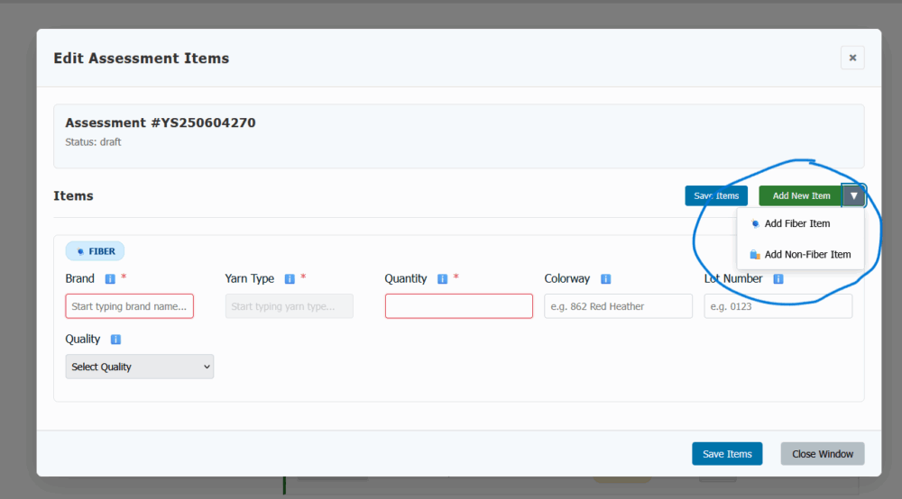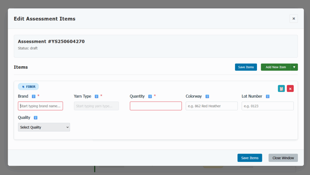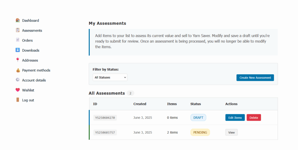 No longer! With managing the assessments digitally through your online account here at Yarn Saver, you don’t need to wait on us to see your “request” to begin the process. All you need to do is create an assessment, add some details about your items, and submit to our assessors directly!