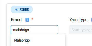 - Yarn Type (Fiber items only): Specify the product line or type. If a matching type is found, a dropdown will offer suggestions to you on what you might be looking for, but it is not required to select an option from the suggestions.