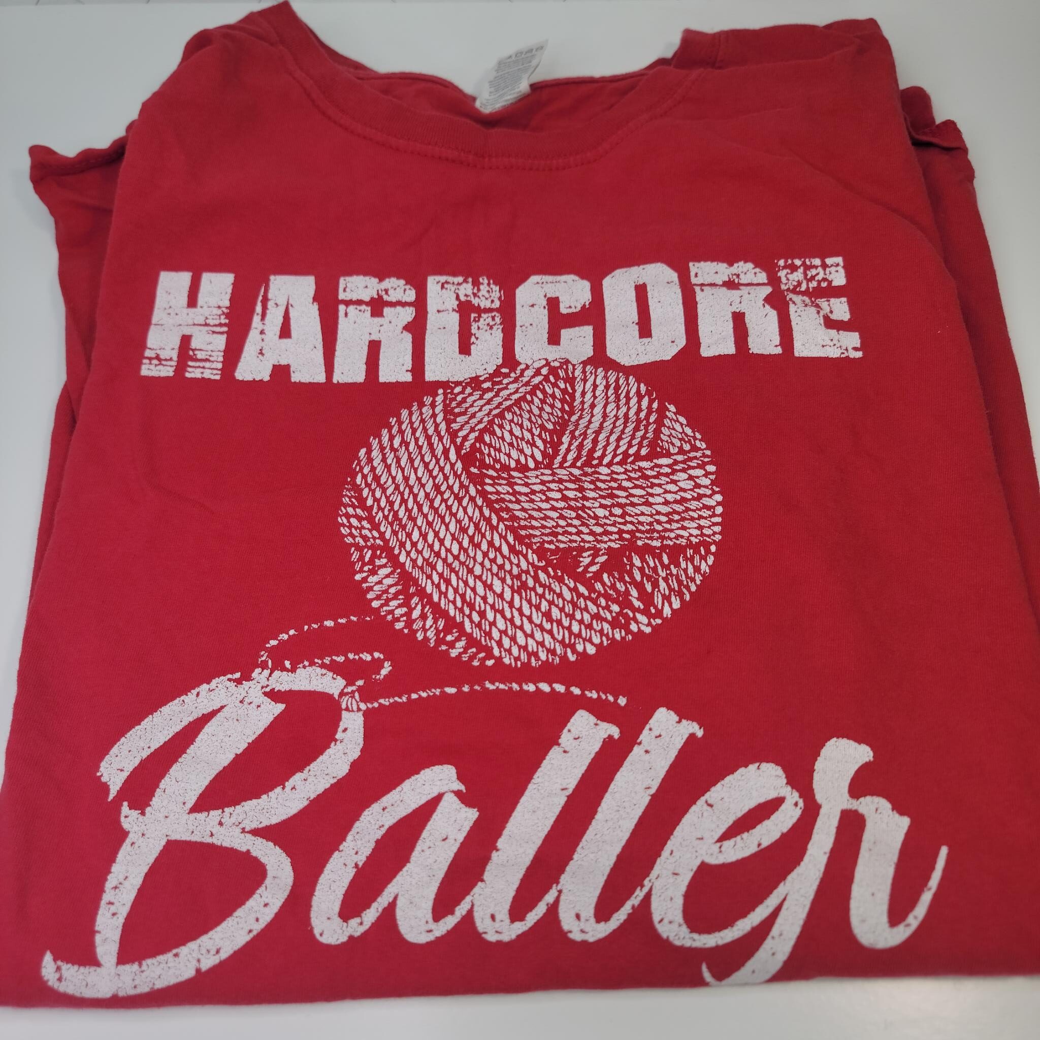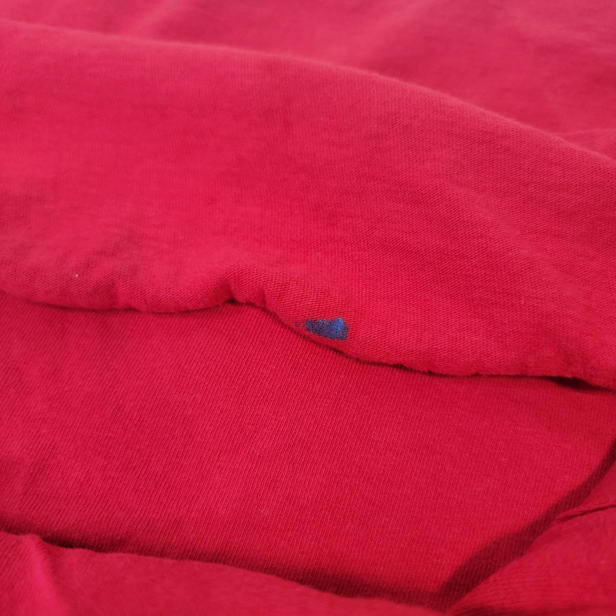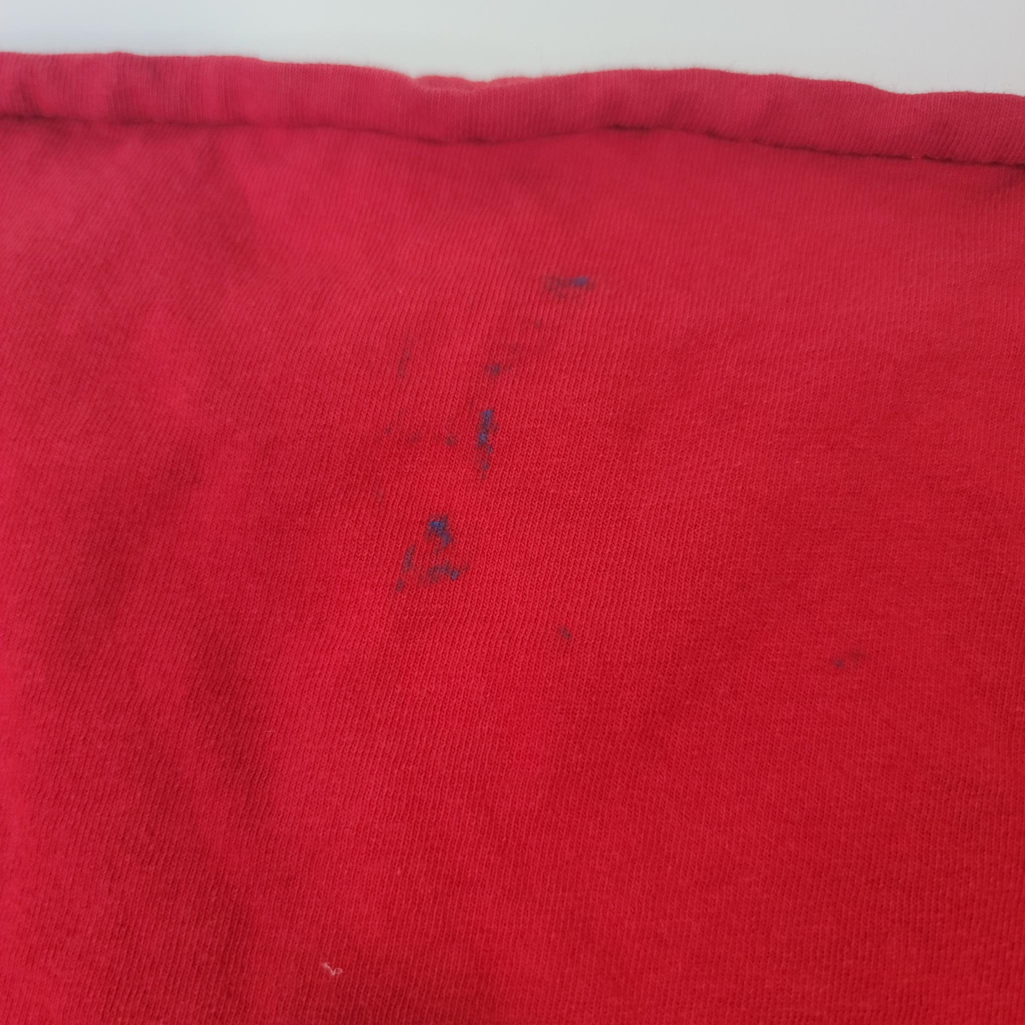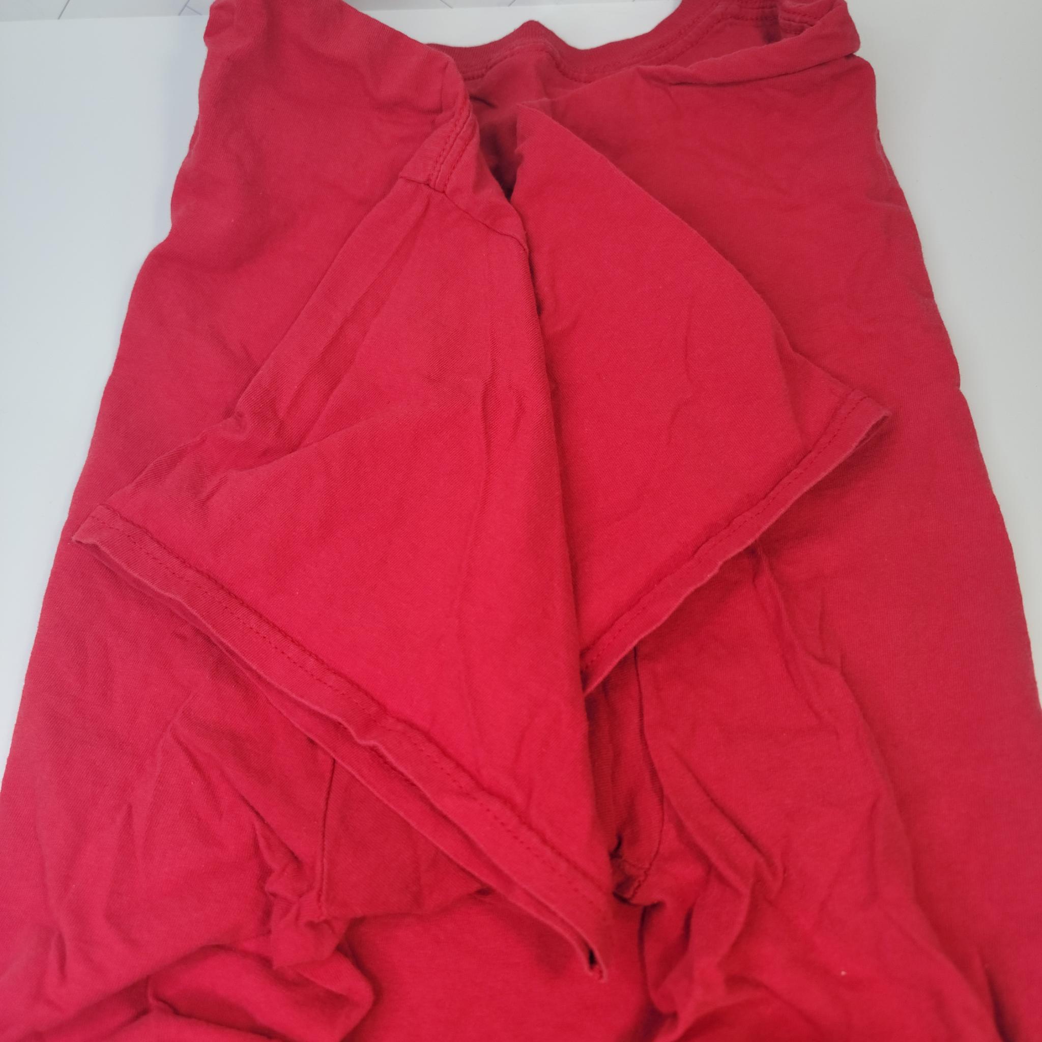 In fair condition. T-shirt brand is Fruit of the Loom. Red 100% cotton material with white print.