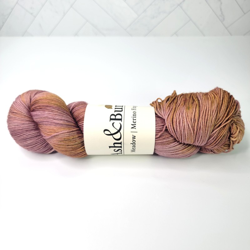 Ash & Bumble Merino Fingering in Mallow Flower 438 yards (401 meters) per skein of 100% Merino Check out more available Ash & Bumble yarns we have in stock at Yarn Saver.